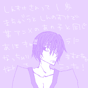 <ルール> ・必ず性別は自分とは違う、異性で ・性格や容姿などを書く時は()に理由を書くこと ・5人以上(やりそうな人)に回すこと 【現在の機種情報】 >>DoCoMoのP902iS ホワイトさん 【名前】 >>定春(えええ) 【性感帯】 >>せいかんたいて…!かんじるとこですよね…! (違ったらごめんなさい変態でごめんなさい) かか、カメラのレンズのふちとか……(滝汗) …感じそう……? 【ケータイから主に一言】 >>「おめーさあ、いっつもオリジ(俗に言うサイレント)で折角ダウンロードした着信音も意味を成してねえじゃねえかそのせいで山崎さんより地味なキャラに成りつつあんだよどうしてくれんだコノヤロー山崎さん越したら終わりだっつうのおまけによォ何回も地面に落っことしやがっておかげでこの素敵な白いボディも台無しだっつうの定春のイメージもぶっ壊れてんだよマジ死んでくんねーから頼むから」 …ごめんなさいそんなに怒らないで下さい努力しますから 【次にバトンを回す人】 >>らやサマ 浅月サマ 桐咲サマ 麻香サマ 簗瀬サマ 別に無視して下さって全然問題ないです…! 楽しかったです回して下さった苓麻サン有難う御座いました! この機会音痴め★SAIが甦りません…。 無題なんてこった!← とうとう銀魂オンリサイトにしてしまいました。。。 こんにちは、柳瀬です 今日はSAIで銀ちゃん002に着色しようかと思ったら試用期間切れ…。 あれダウンロードするのよく分からなくて苦手なんですよねえ。 やってはみたんですが何度ダウンロードしても試用期間が切れっぱなし…。 涙が出ます。泣きたいです。 ライセンス(?)とか買えば良いんでしょうがお金のかかることは出来ないので仕方がないです。 頑張ります。あとでもう1回挑戦してみます。 ……だけど誰か心当たりのあるかたアドバイス求む、です(おいいい) そういえば! 私ったらちゃっかり進級できちゃいましたよ!(え) 成績表来るまでドッキドキしてましたが なんだか気づいたらちゃんと進級してましたえへ。 あああ!そんなことどうでも良いですね! 忘れてました! 4000Hit有難う御座います!! 馬鹿かお前は!大事なこと忘れちゃって! すいませんスイマセンごめんなさい申し訳ありません! 本当に有難う御座います! そのうちお礼絵なんかをガリガリ描こうと思います。 初★キリリク(´∀`人)有難う御座います!